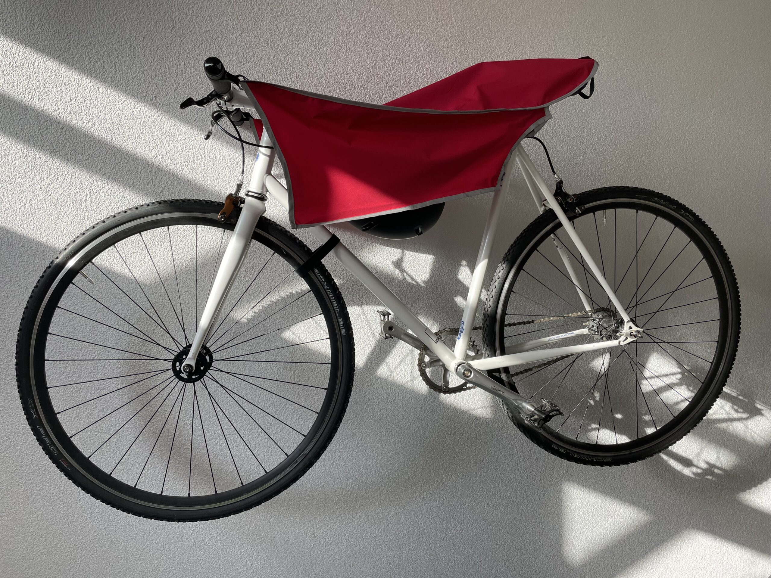 Das neue Modell des Radfahrer Regenschutzes ist 2in1: der erste Regenschutz der neben den Beinen auch den Sattel trocken hält! Selbst der Helm bleibt beim Parken im Trockenen.