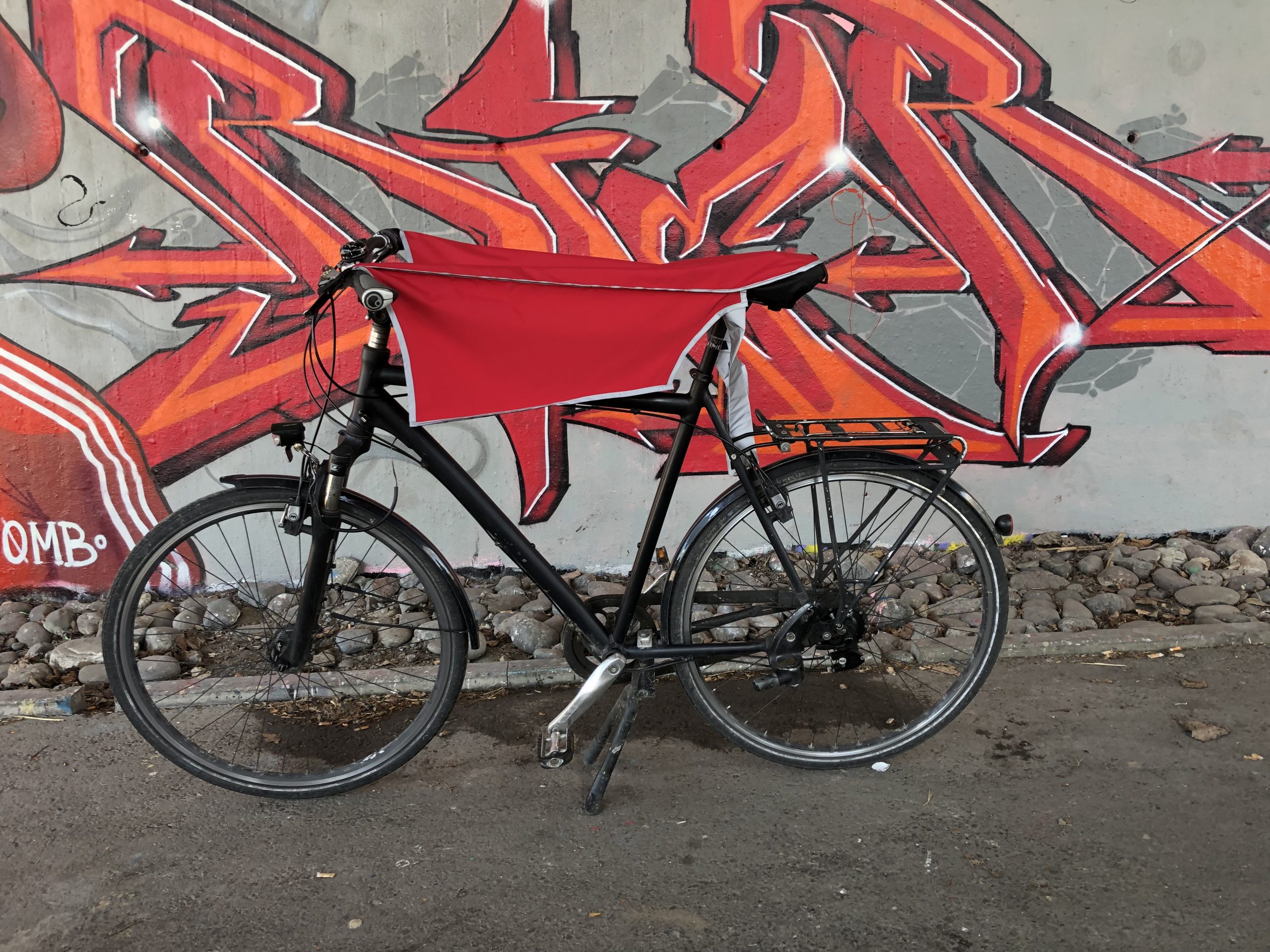 Ich bin jetzt glückliche Besitzerin der roten 2 in 1 Drachenhaut. Sie hat mir bei meinem 12 km Heimweg im strömenden Regen die Beine und auch meine Tasche trocken gehalten. Gegen eine Regenhose habe ich mich wegen dem umständlichen Anziehen immer gesträubt. Bei einem kurzen Einkauf unterwegs hatte ich einen trockenen Sattel und einige Bewunderer. Am Rad kann man sie an der angebrachten Lasche mit dem Schloss befestigen. Die Drachenhaut ist mit den Klett- und Gummibändern absolut einfach zu handhaben und sehr gut durchdacht und die reflektierenden Streifen sind gut sichtbar. Und zum Mitnehmen ist sie einfach und klein in der integrierten Hülle zu verstauen. Ich bin einfach begeistert.